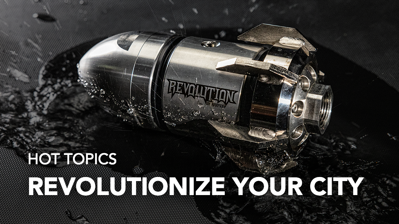 The all-in-one sewer jetting tool that builds on the cutting power of the Reaper, with the same front rotating stream and rear jets to clear the toughest blockages …BUT the Revolution® goes a step further adding dual rotating center streams with powerful 360° cleaning power to completely clean and de-scale the inside of the pipe.